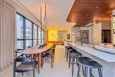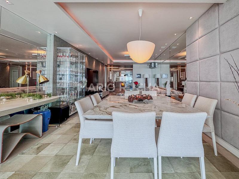 Com 219m² privativos, o apartamento impressiona pela amplitude dos ambientes e pela linda vista para o mar, ampla e permanente, que transforma o oceano em protagonista do dia a dia.