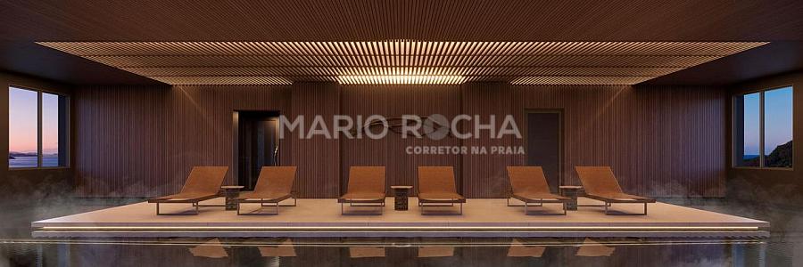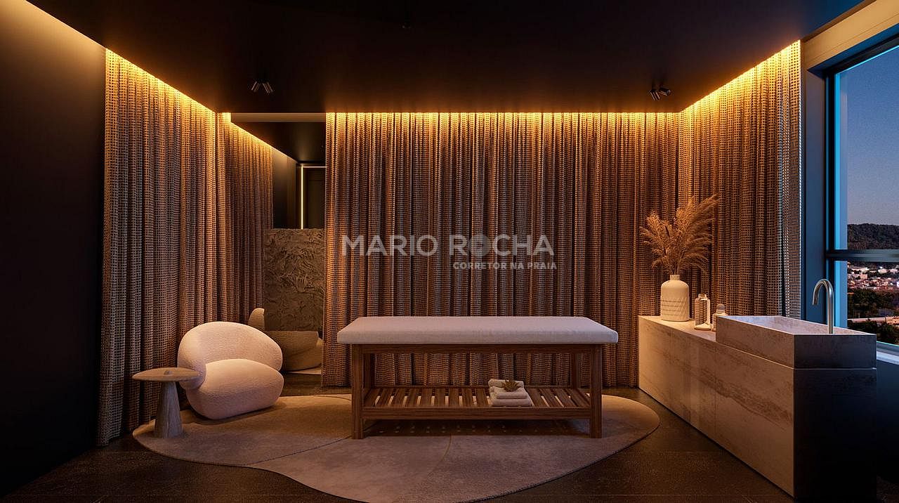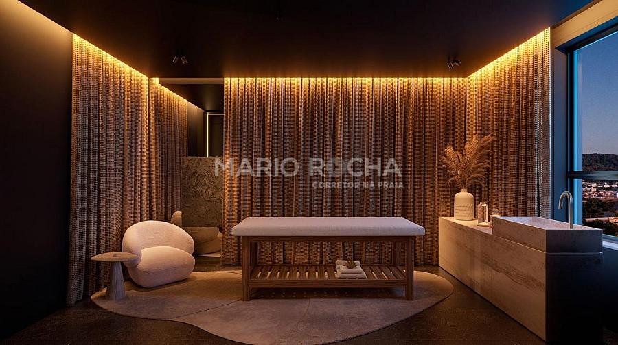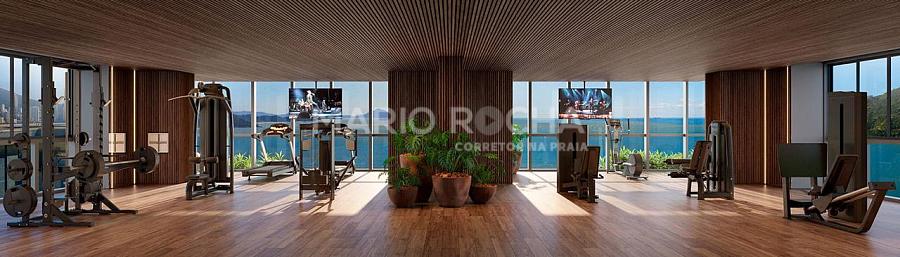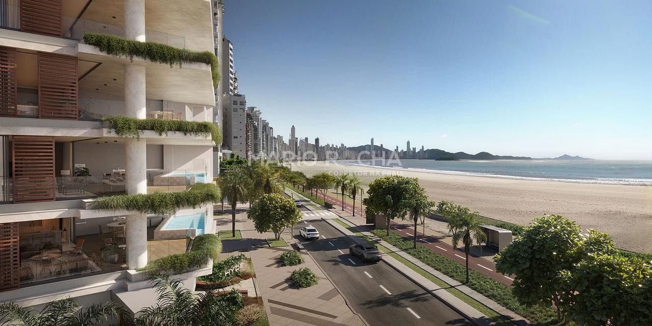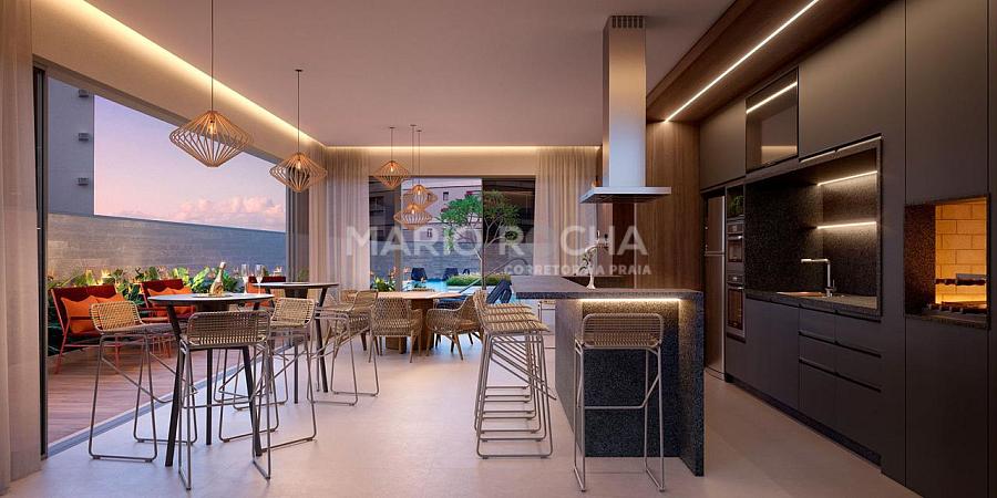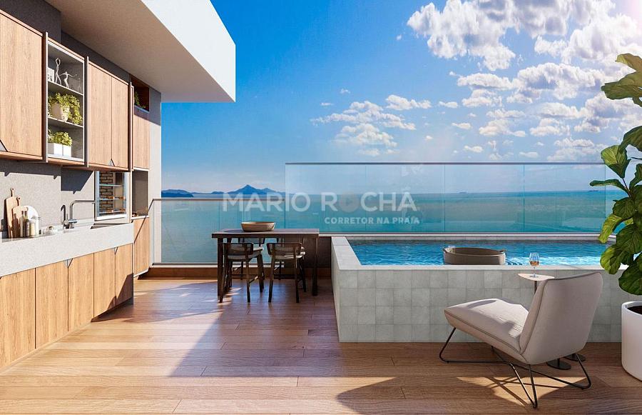 A área social é imponente e se abre para a sacada com churrasqueira a carvão de frente para o mar, onde a vista panorâmica em andar alto transforma o oceano em protagonista, criando um cenário simplesmente impressionante em todos os momentos do dia.