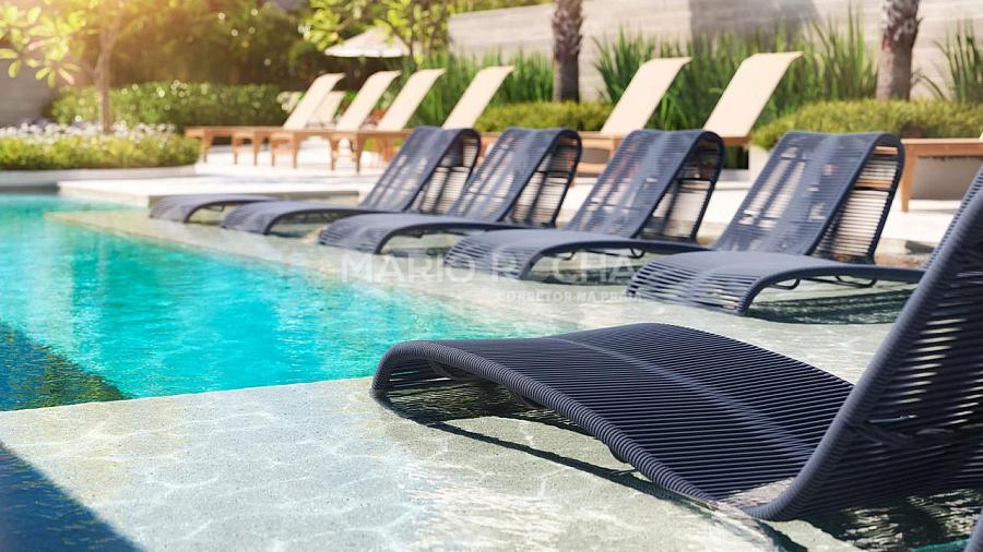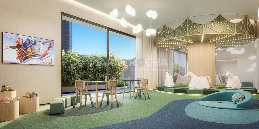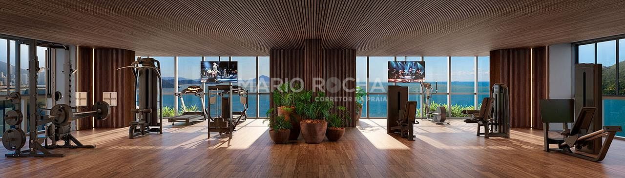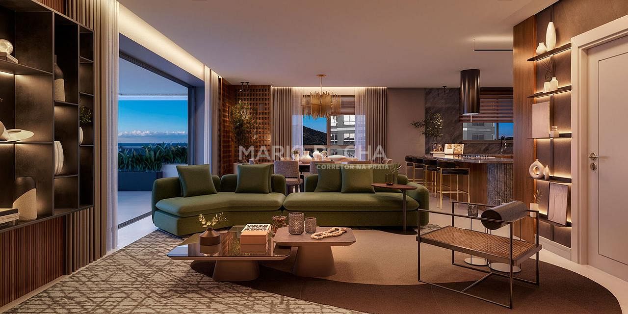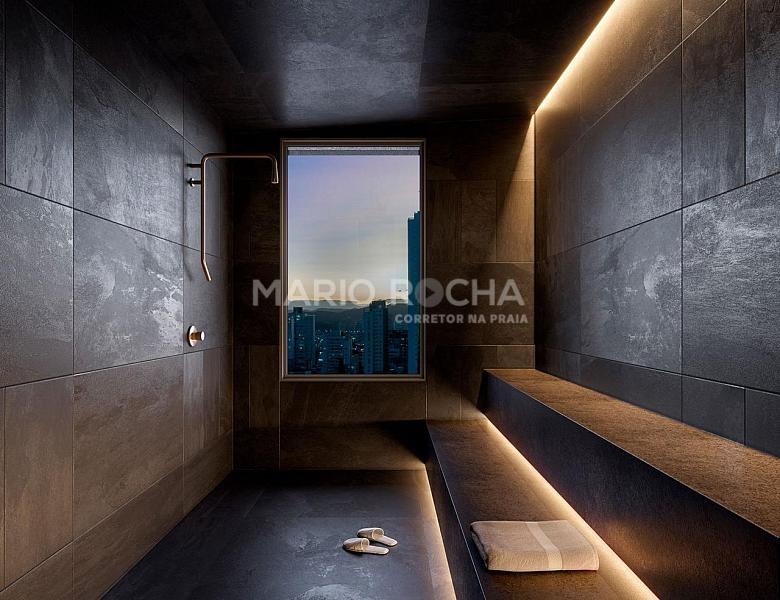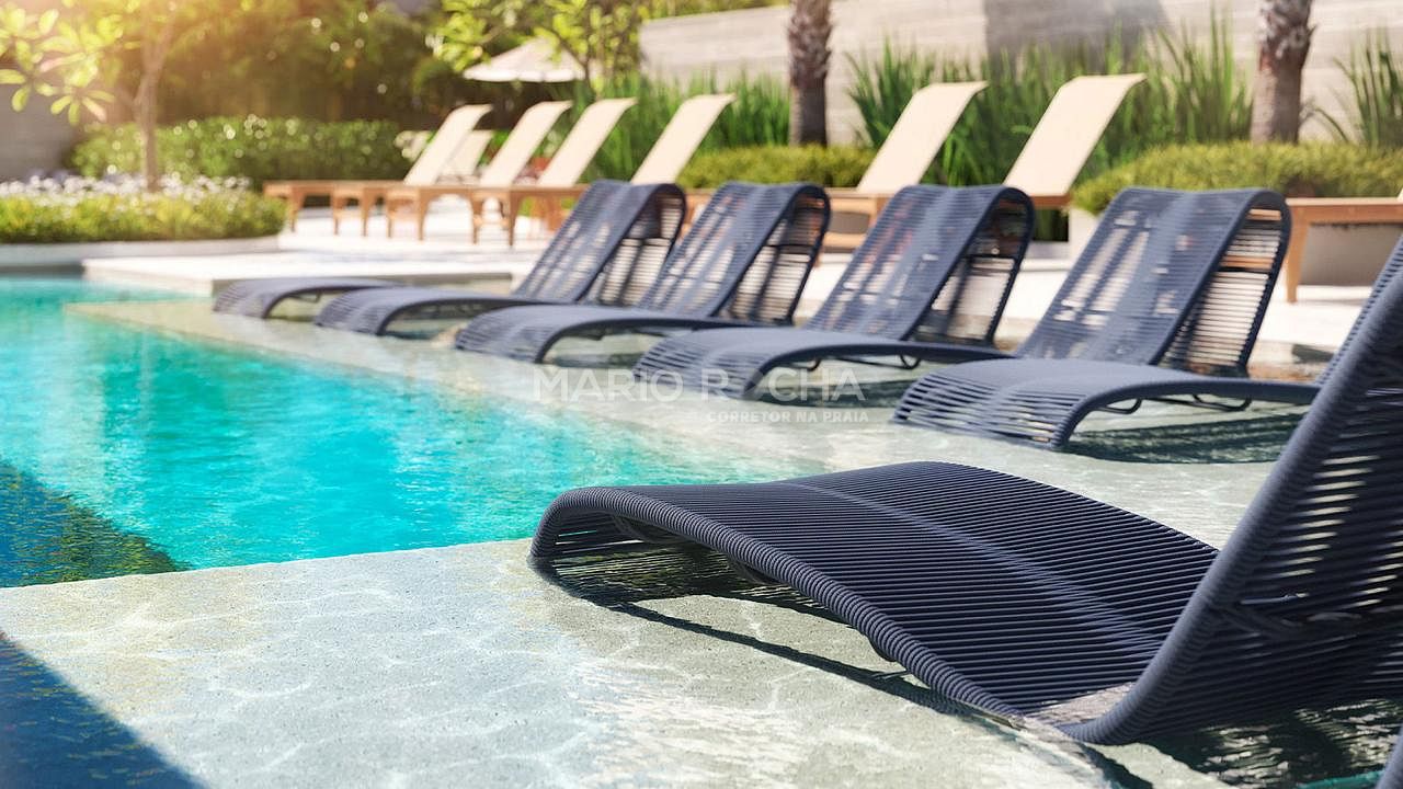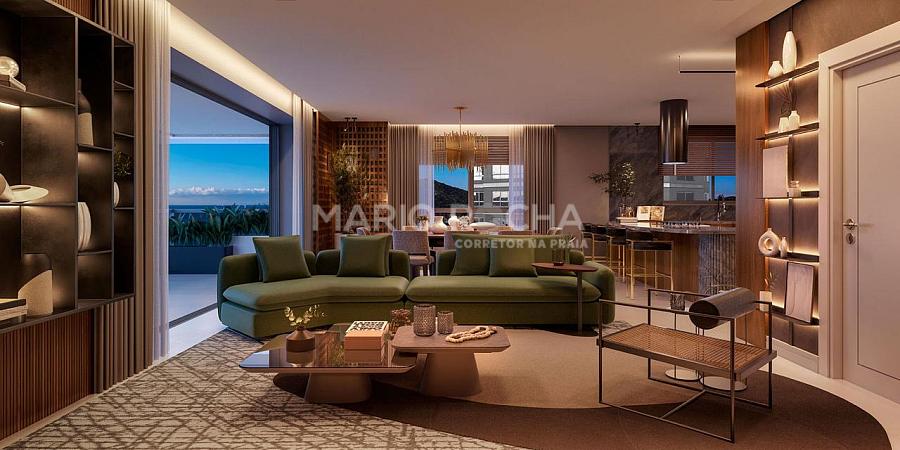 A área social é imponente e se abre para a sacada com churrasqueira a carvão de frente para o mar, onde a vista panorâmica em andar alto transforma o oceano em protagonista, criando um cenário simplesmente impressionante em todos os momentos do dia.