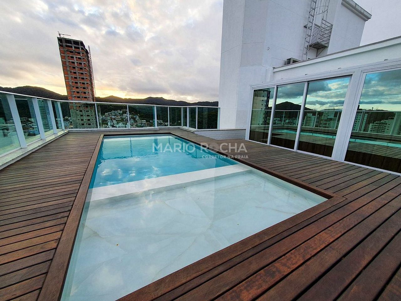 No pavimento superior, a cobertura surpreende com uma área externa diferenciada, onde se encontra a piscina privativa, criando um ambiente exclusivo para relaxar e aproveitar com total privacidade.